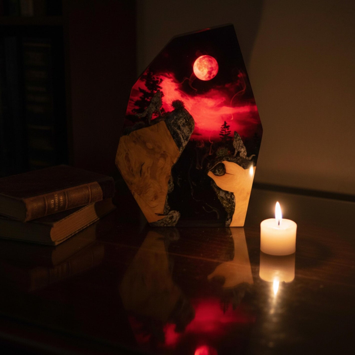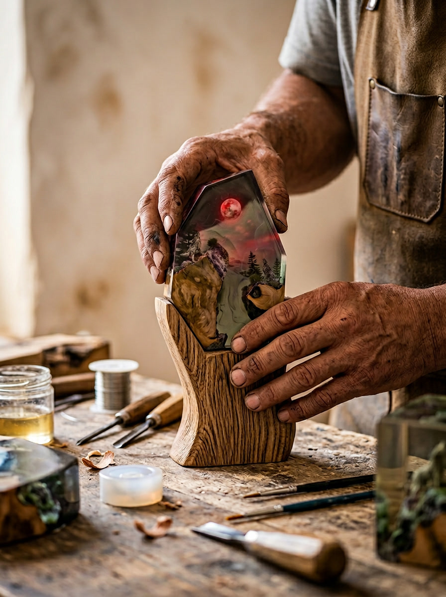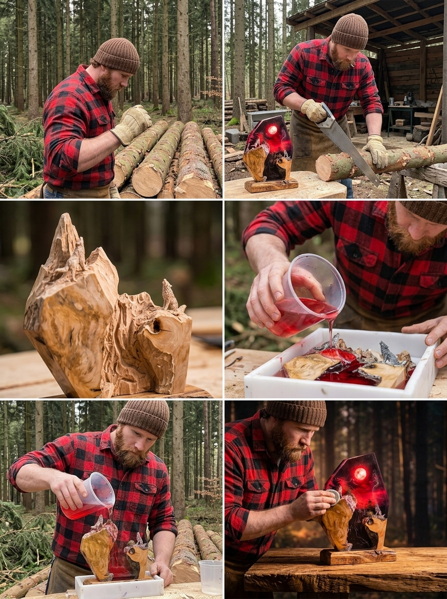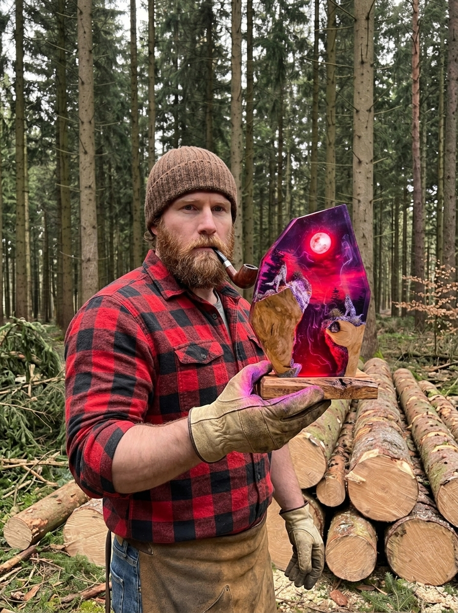 Jedes Stück ist eine Miniatur-Waldlandschaft — uralte Holzmaserung, feuriges rotes Harz und das tiefe Leuchten einer Glut, eingefangen in kristallklarem Harz auf einem robusten Sockel mit integrierter LED. Schalten Sie das Licht ein und die gesamte Szene strahlt Wärme von innen heraus. Handgefertigt. Keine Kompromisse. Gemacht für alle, die die Wildnis lieben.